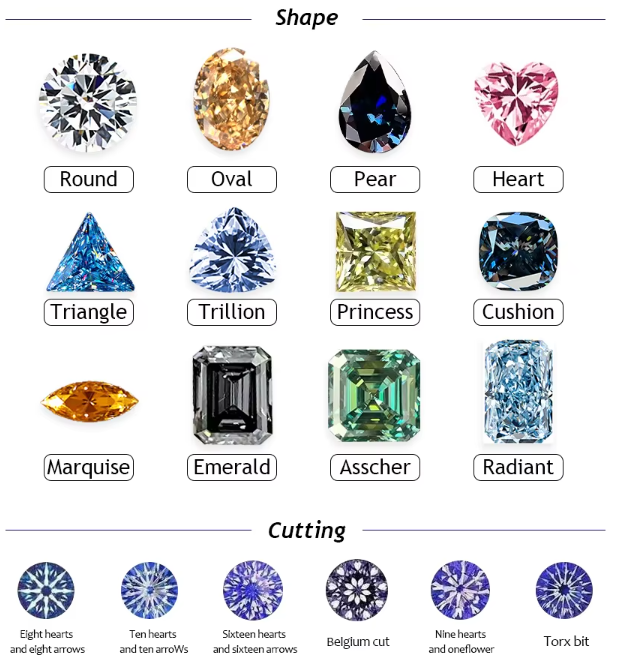 | Shape | Round, Oval, Pear, Cushion, Heart, Emerald, Marquise, etc. |